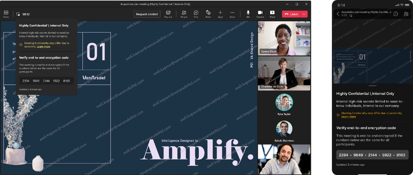 借助 Teams 高级版中今天提供的高级会议保护,你可以轻松升级机密商务会议的保护措施,而不会妨碍会议体验。新的会议选项(例如水印以防止泄漏和限制谁可以录制)为您提供了额外的保护,以保持讨论的私密性。会议组织者可以利用与会者屏幕共享和视频源上的独特水印来自信地呈现和显示敏感信息。对于那些需要禁用某些核心会议功能以实现高级加密选项的罕见、极其敏感的会议,支持 IT 的用户可以对会议应用端到端加密 (E2EE) 选项。提醒一下,在 Teams 通话或会议期间交换的数据始终使用传输中和静态的行业标准加密进行保护。
